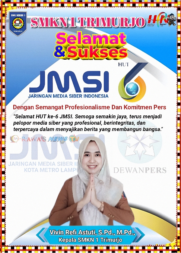Kepala SMKN 1 Trimurjo, Vivin Refi Astuti, S.Pd., M.Pd., ucapkan “Selamat HUT ke-6 JMSI. Semoga semakin jaya, terus menjadi pelopor media siber yang profesional, berintegritas, dan terpercaya dalam menyajikan berita yang membangun bangsa.”