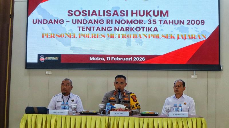 Kota Metro, rawasnews-tv.com – Dalam upaya memperkuat kapasitas sumber daya manusia serta meningkatkan kualitas penegakan hukum di bidang pemberantasan narkotika, Polres Metro menggelar Sosialisasi Hukum Undang-Undang Nomor 35 Tahun 2009 tentang Narkotika. Kegiatan ini dilaksanakan di Aula Sanika Satyawadha Polres Metro dan diikuti oleh personel Polres Metro beserta polsek jajaran. Rabu, (11/02/26).