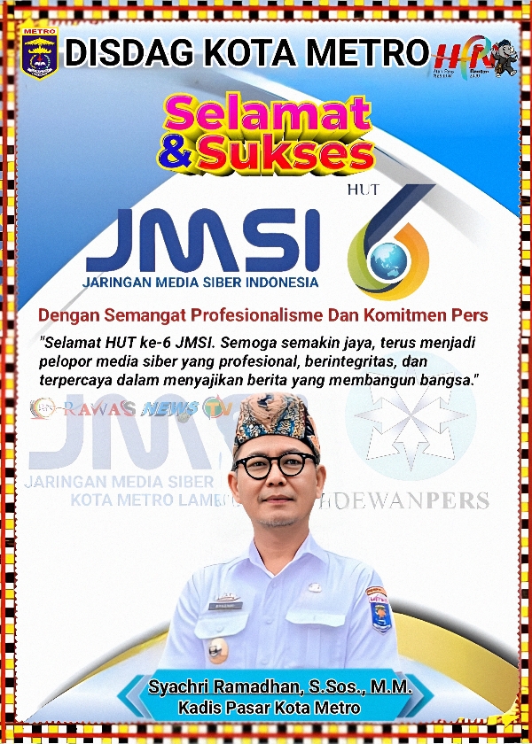 Kepala Dinas Perdagangan (Kadis Dag) Kota Metro, Syachri Ramadhan, S.Sos., M.M. ucapkan “Selamat HUT ke-6 JMSI. Semoga semakin jaya, terus menjadi pelopor media siber yang profesional, berintegritas, dan terpercaya dalam menyajikan berita yang membangun bangsa.”