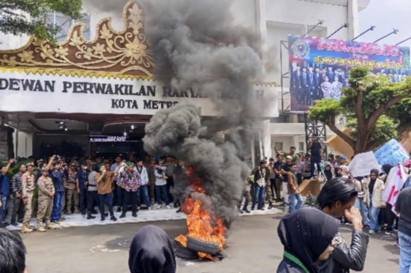 Kota Metro, rawasnews-tv.com – Ratusan mahasiswa yang tergabung dalam Aliansi Mahasiswa Kota Metro, melakukan aksi demonstrasi dengan membakar ban di depan gedung kantor legislatif sebagai bentuk kekecewaan terhadap jalannya pemerintahan daerah, Selasa 10 Maret 2026. Dalam aksinya tersebut, ratusan mahasiswa menyoroti 13 program unggulan pemerintah daerah yang dinilai perlu segera dievaluasi, dan dimaksimalkan pelaksanaannya.