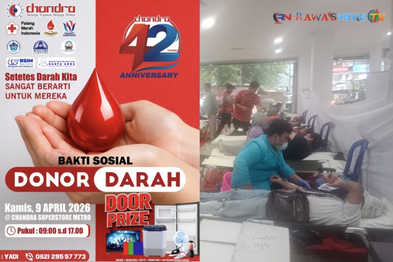 Kota Metro, rawasnews-tv.com – Dalam rangka memperingati Hari Ulang Tahunnya (HUT) yang ke – 42, Chandra Superstore menggelar donor darah yang terbuka untuk umum dengan target, yakni mengumpulkan 500 kantong darah, Kamis (9/4/2026). Dalam acara tersebut, Chandra Superstore Metro bekerja sama dengan Dinas Kesehatan Kota Metro, PMI Kota Metro serta PSMTI Metro.