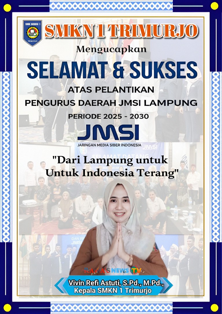 Kepala SMKN 1 Trimurjo, Vivin Refi Astuti, S.Pd., M.Pd. mengucapkan, Selamat & Sukses atas pelantikan Ketua JMSI Provinsi Lampung, Priode 2025 - 2030