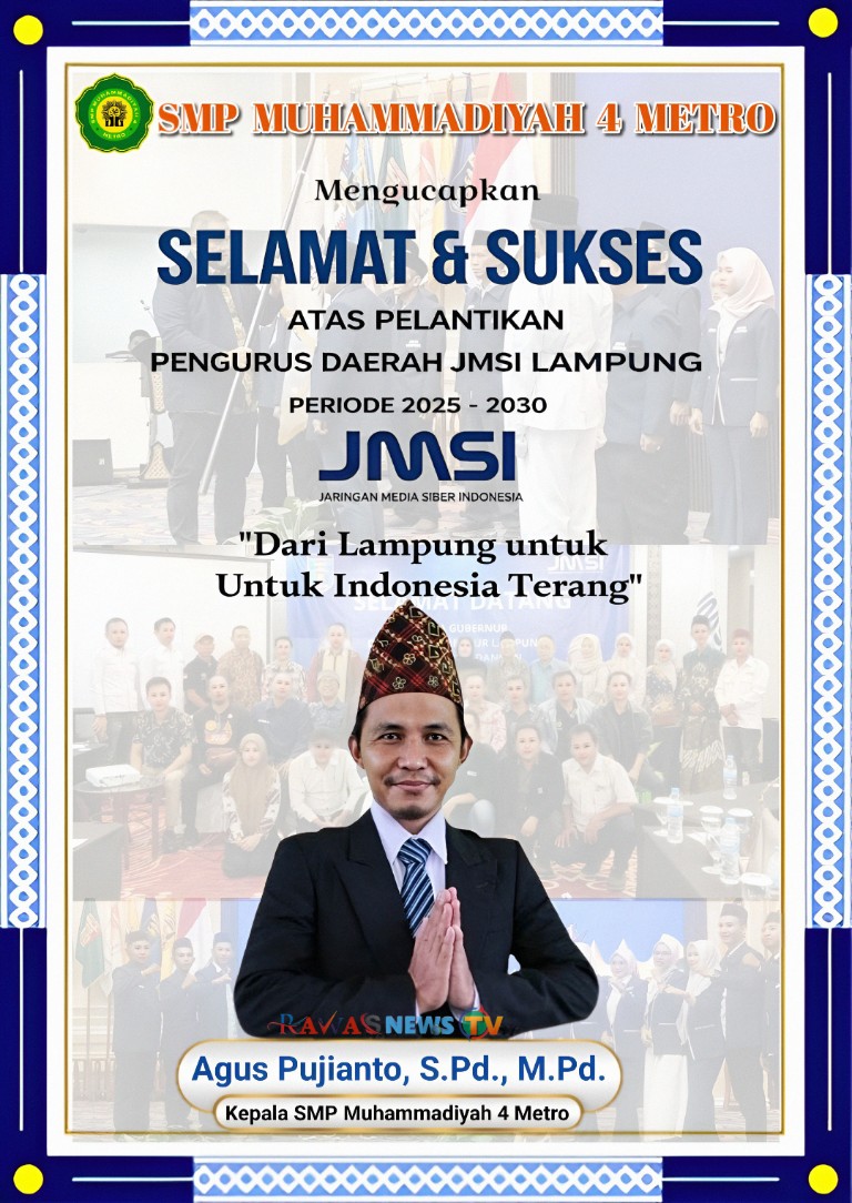 Kepala Muhammadiyah 4 Kota Metro, Agus Pujianto, S.Pd., M.Pd. mengucapkan, Selamat & Sukses atas pelantikan Ketua JMSI Provinsi Lampung, Priode 2025 – 2030. Semoga terus bersinergi, berkarya, dan berintegritas dalam mewujudkan media siber yang profesional. Dari Lampung Untuk Indonesia Terang.