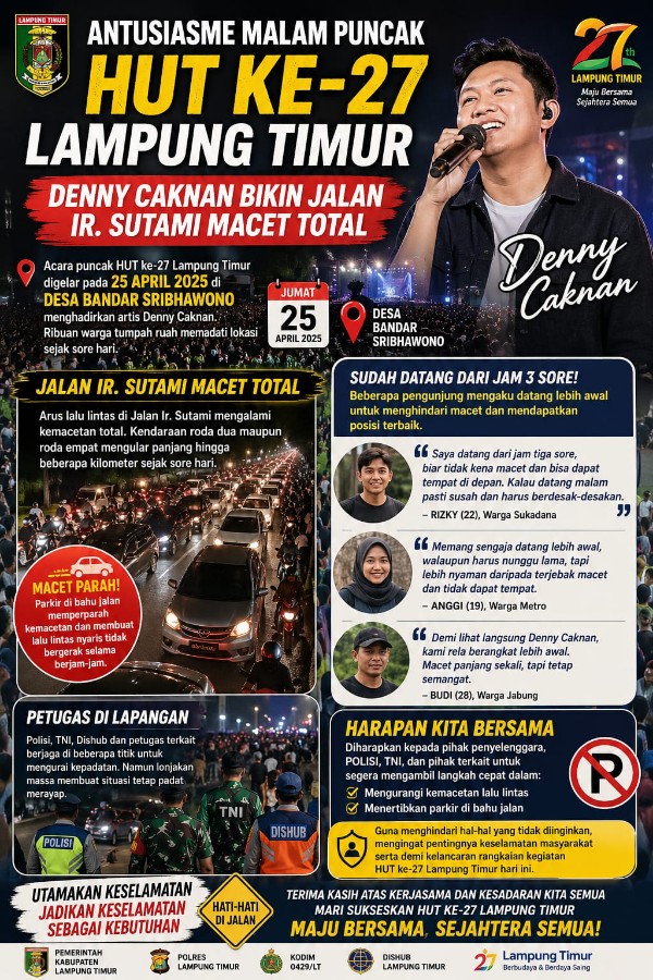 Acara puncak HUT Lampung Timur tersebut digelar pada 25 April di Desa Bandar Sribhawono, yang dipadati ribuan warga dari berbagai daerah sejak sore hari. Kehadiran Denny Caknan, menjadi daya tarik utama yang membuat masyarakat berbondong-bondong datang ke lokasi acara.