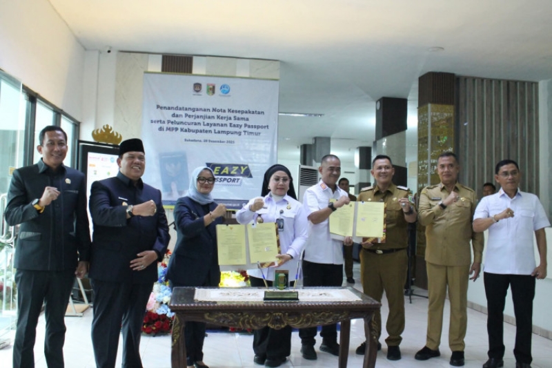 Lampung Timur, rawasnews-tv.com – Pemerintah Kabupaten Lampung Timur terus berupaya menghadirkan pelayanan publik yang semakin dekat, cepat, dan mudah diakses masyarakat. Komitmen tersebut diwujudkan melalui penandatanganan Nota Kesepahaman (MoU) dan Perjanjian Kerja Sama (PKS), antara Dinas Penanaman Modal dan Pelayanan Terpadu Satu Pintu (PMPTSP) Kabupaten Lampung Timur dengan Kantor Imigrasi Kelas II Non TPI Kalianda, yang dirangkaikan dengan Launching Layanan Eazy Paspor di Mall Pelayanan Publik (MPP) Kabupaten Lampung Timur, senin (29/12/2025).